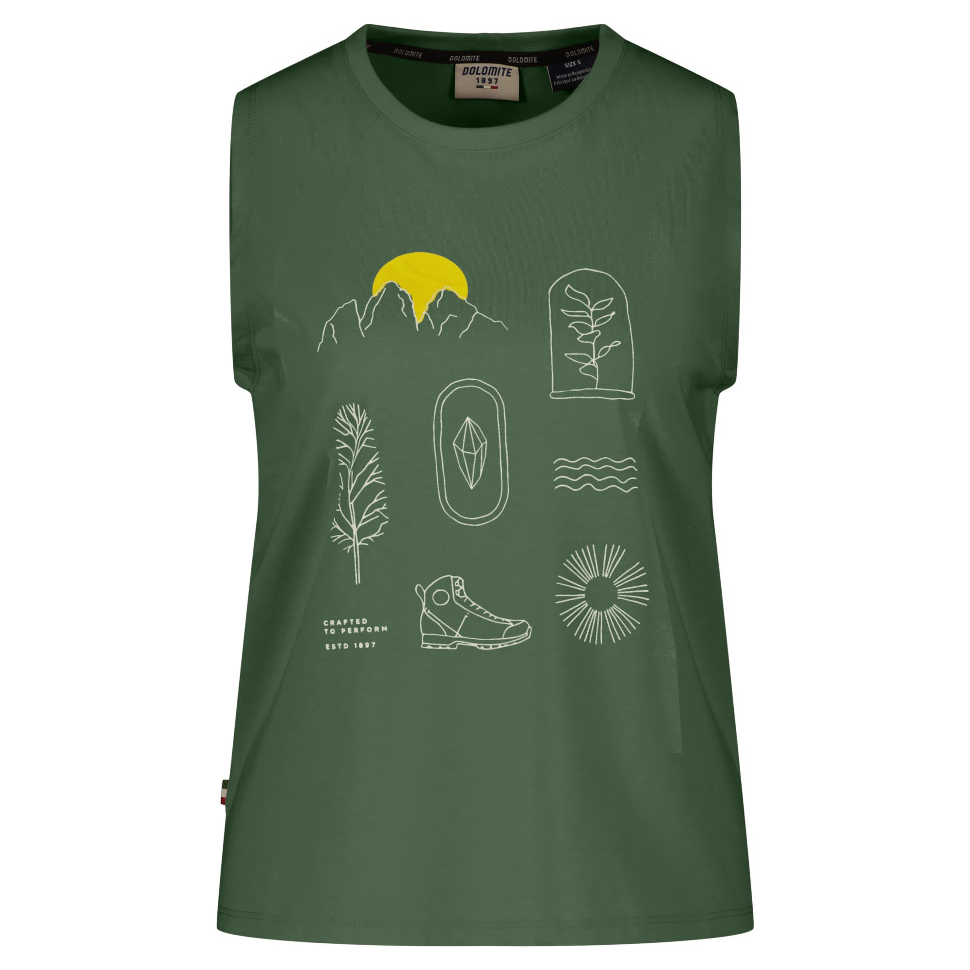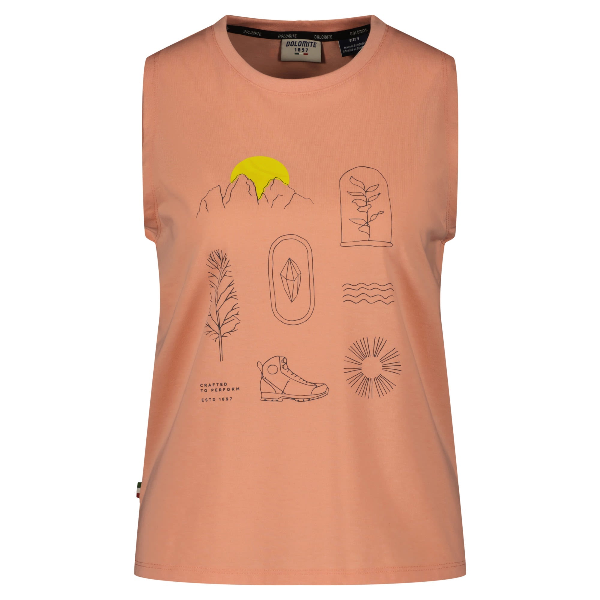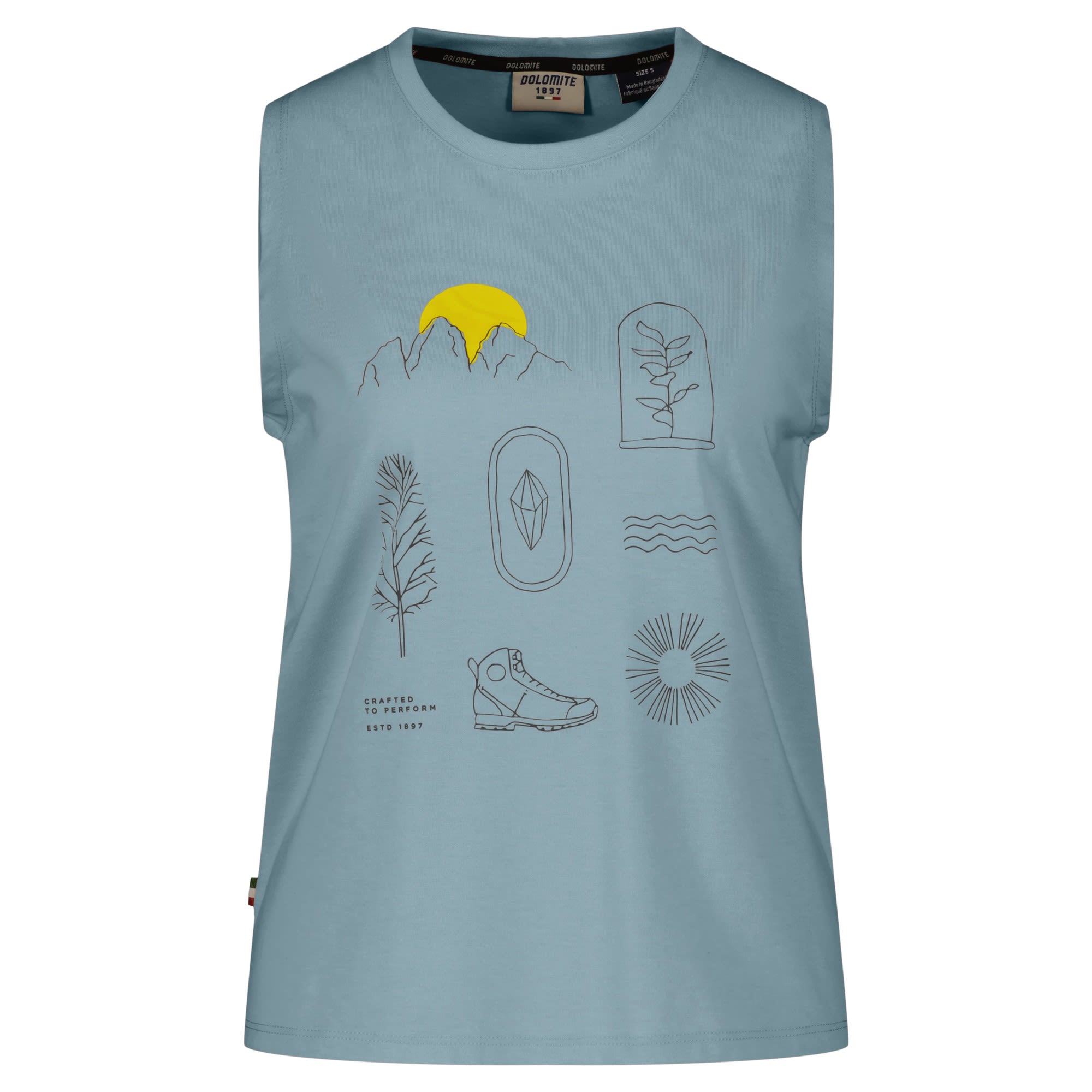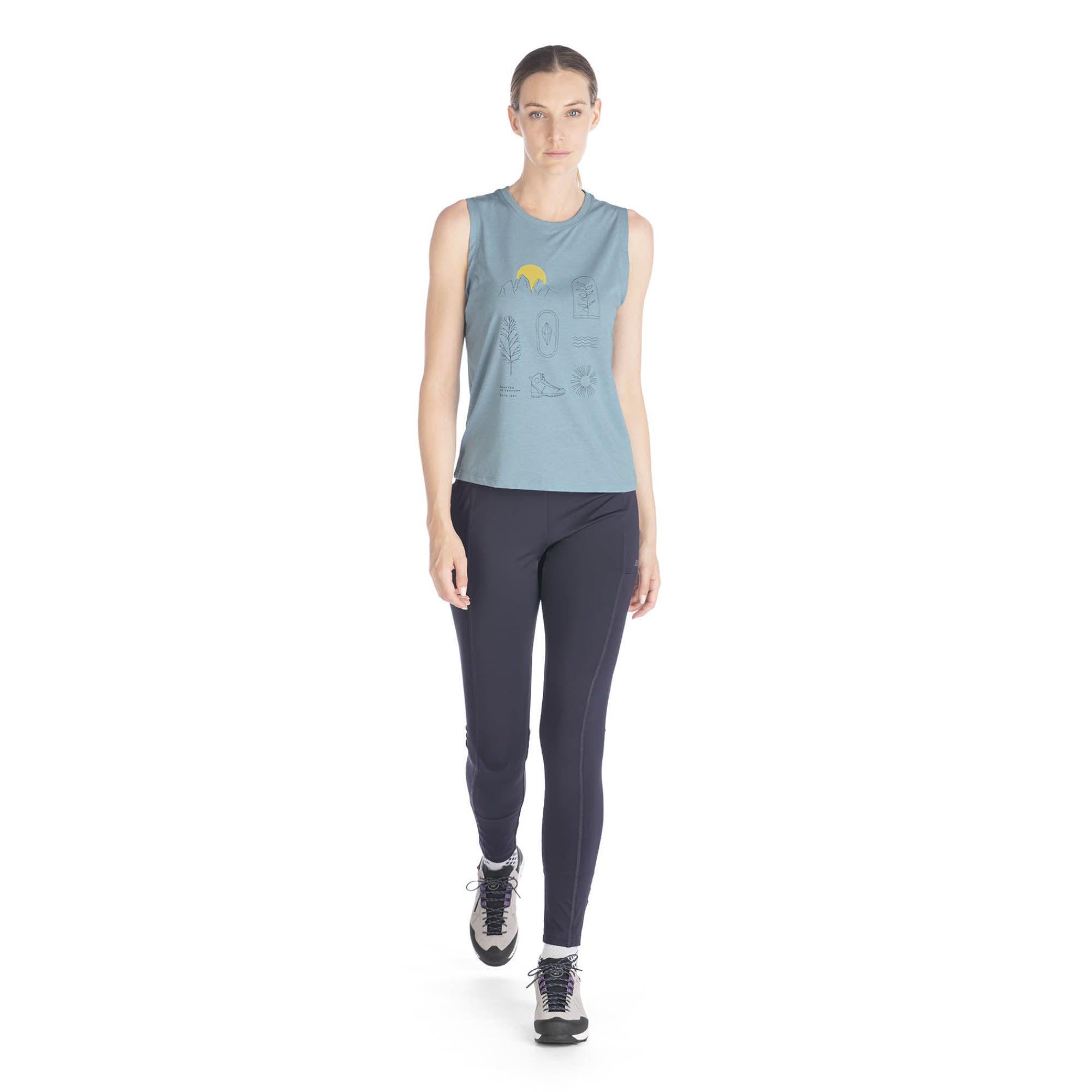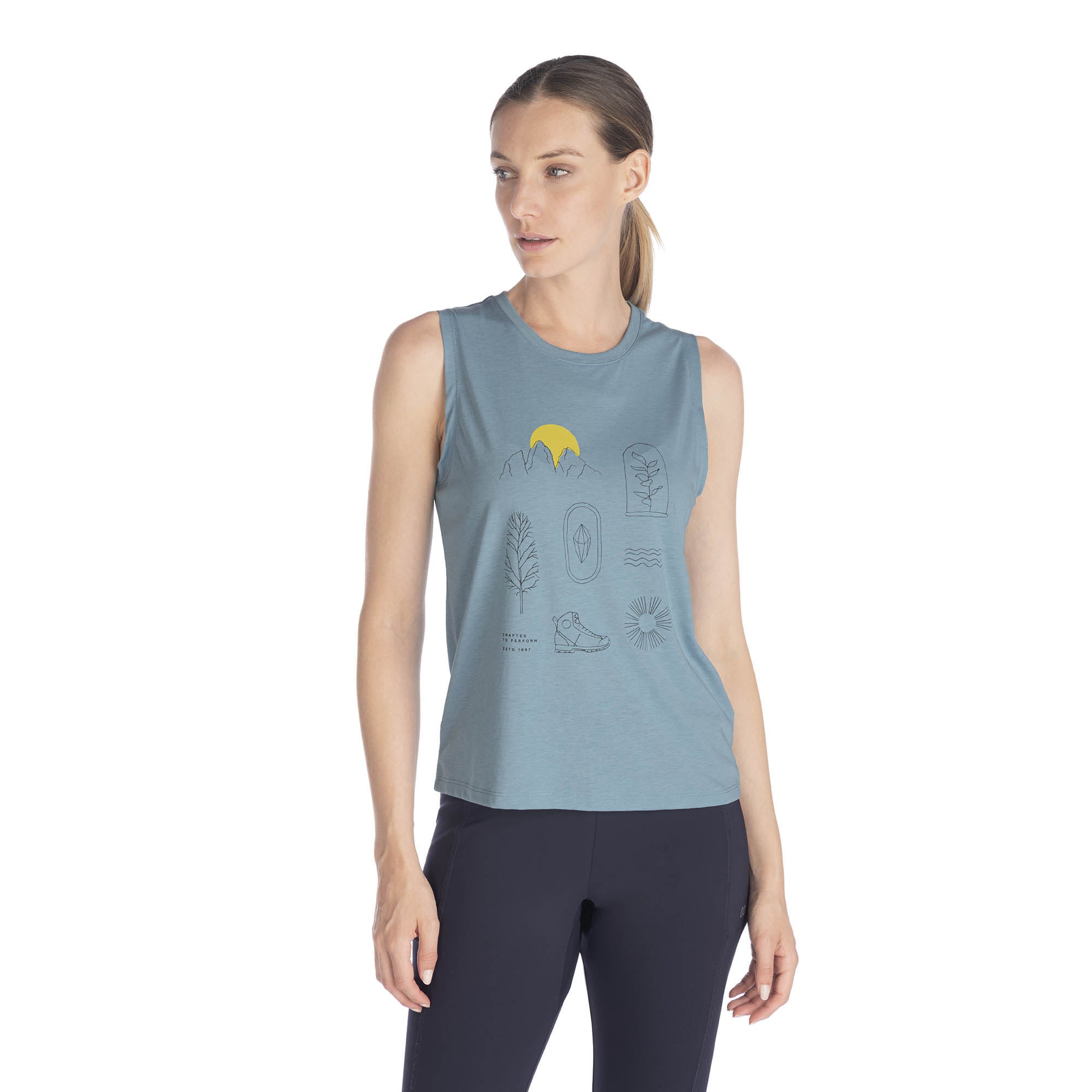 Its mountain-inspired icons and sleeveless design add a touch of outdoor flair to your look.