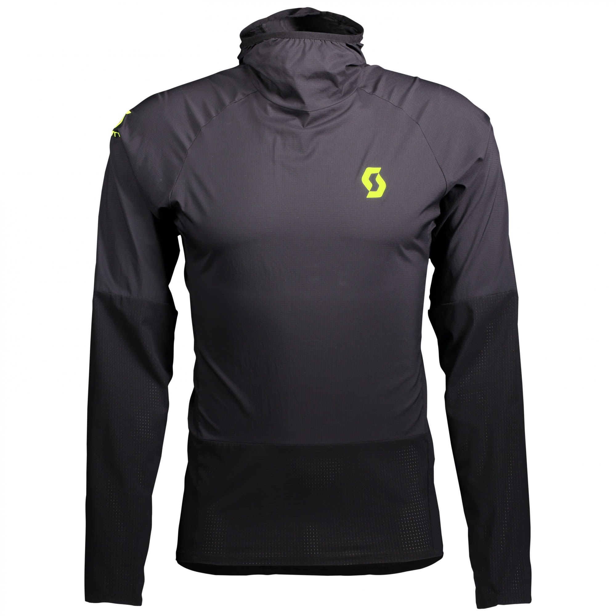 No zipper for this tight-fit, ultra-lightweight piece that features a functional choice of fabrics, wind protection at the front and stretchable lightweight fabric at the back and sleeves.