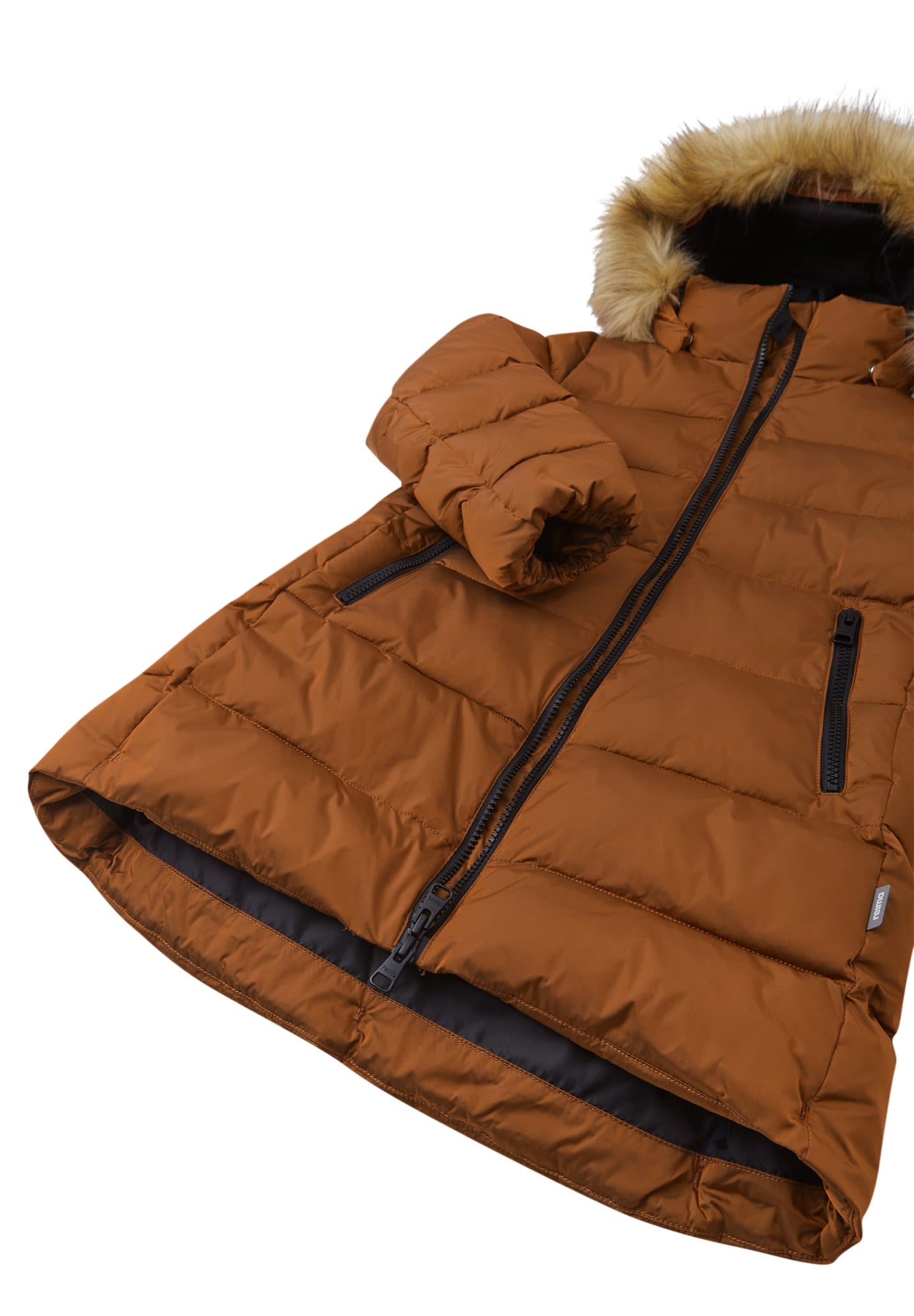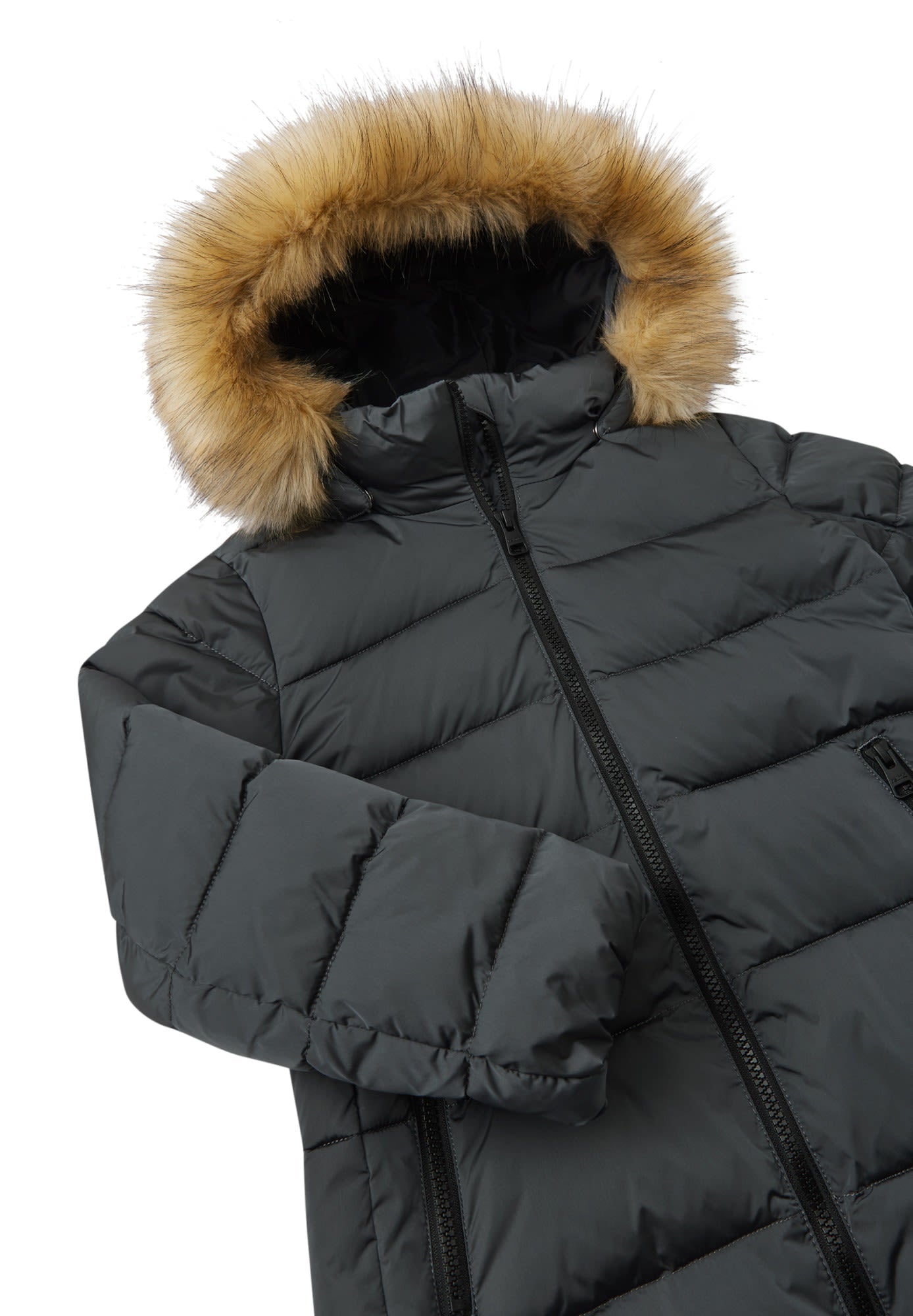 • Safe, detachable hood with detachable faux fur trim
