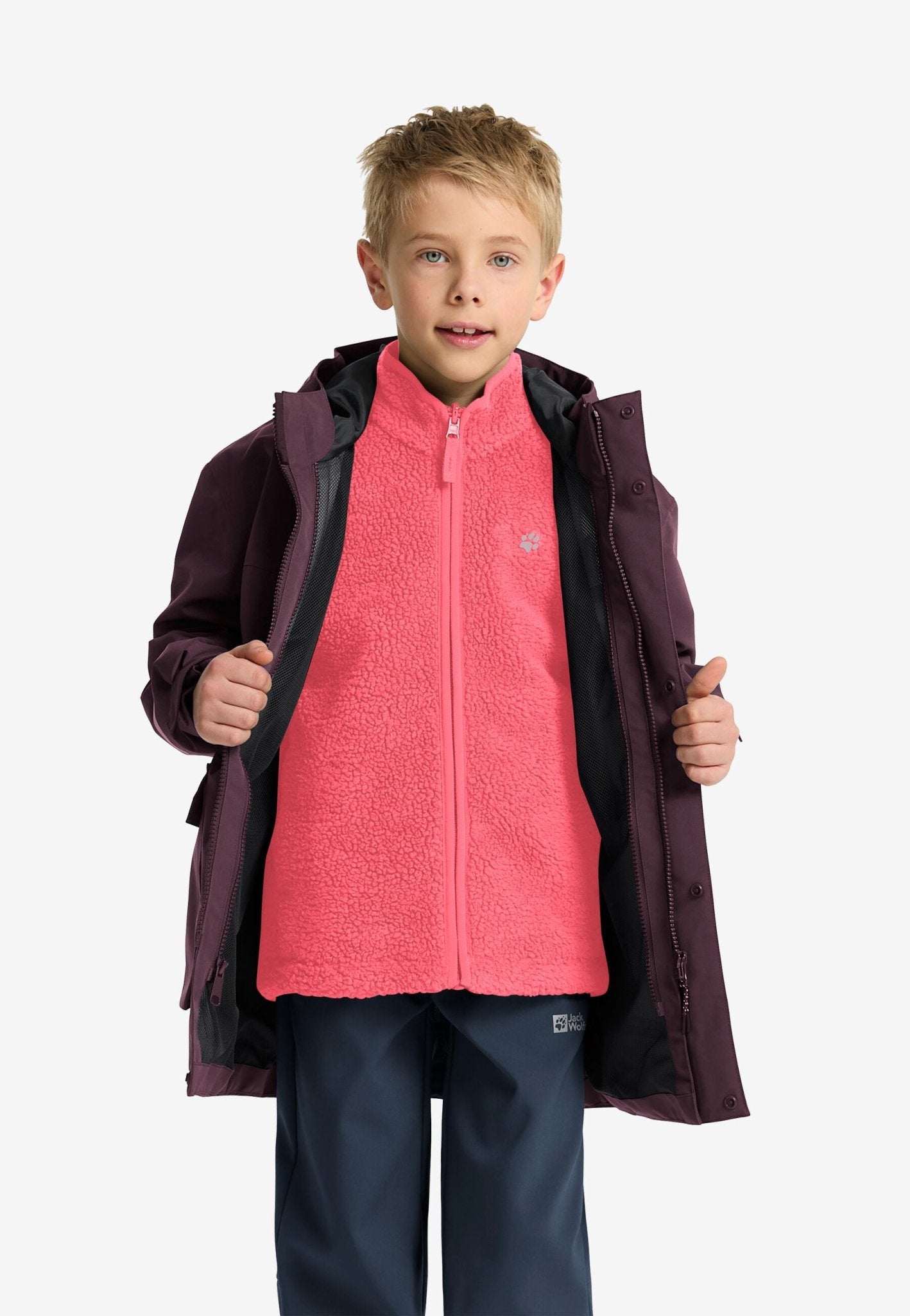 The 3in1 CANVEY KIDS is your reliable companion for changing seasons. The outer jacket with TEXAPORE CORE membrane provides complete protection from rain and wind, while the removable FLEECE 300 inner jacket offers intense warmth. You can wear it flexibly: the outer jacket alone in mild, damp weather or both layers combined for robust winter protection. The hood adapts to your needs, and the thoughtful construction guarantees freedom of movement while playing and exploring. With this jacket, you are prepared for any change in weather – without compromising on comfort or functionality.