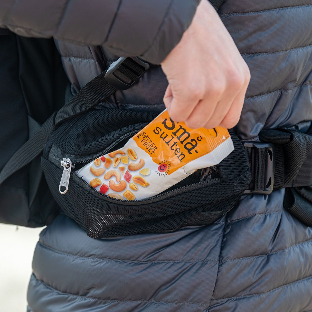 Pack: Deckelöffnung mit Schneefang. Durchgehende Reißverschlussöffnung auf der Vorderseite. Kompressionsriemen an beiden Seiten. Strapazierfähiges, PFAS-freies Cordura®-Material.