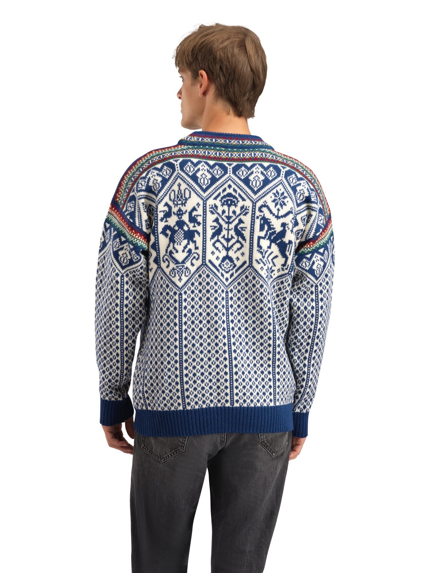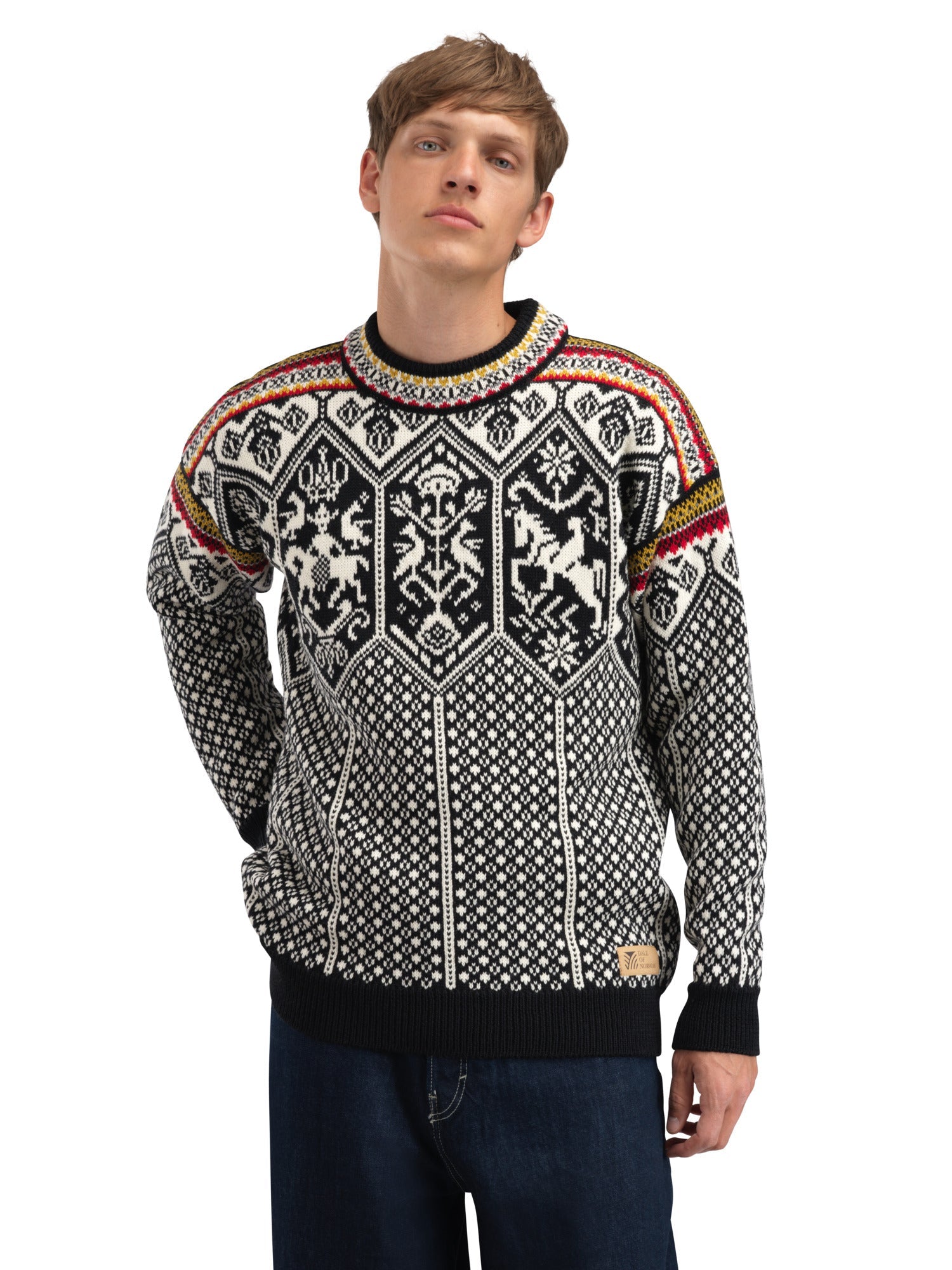 A modern update of one of our greatest successes ever, our official Olympic sweater from the 1994 Winter Olympics in Lillehammer. While the shape has been modernized to a regular fit, the pattern remains more or less unchanged from the original: it consists of symbols and figures from Norse mythology. An almost 30-year-old classic has been updated and given a modern look.