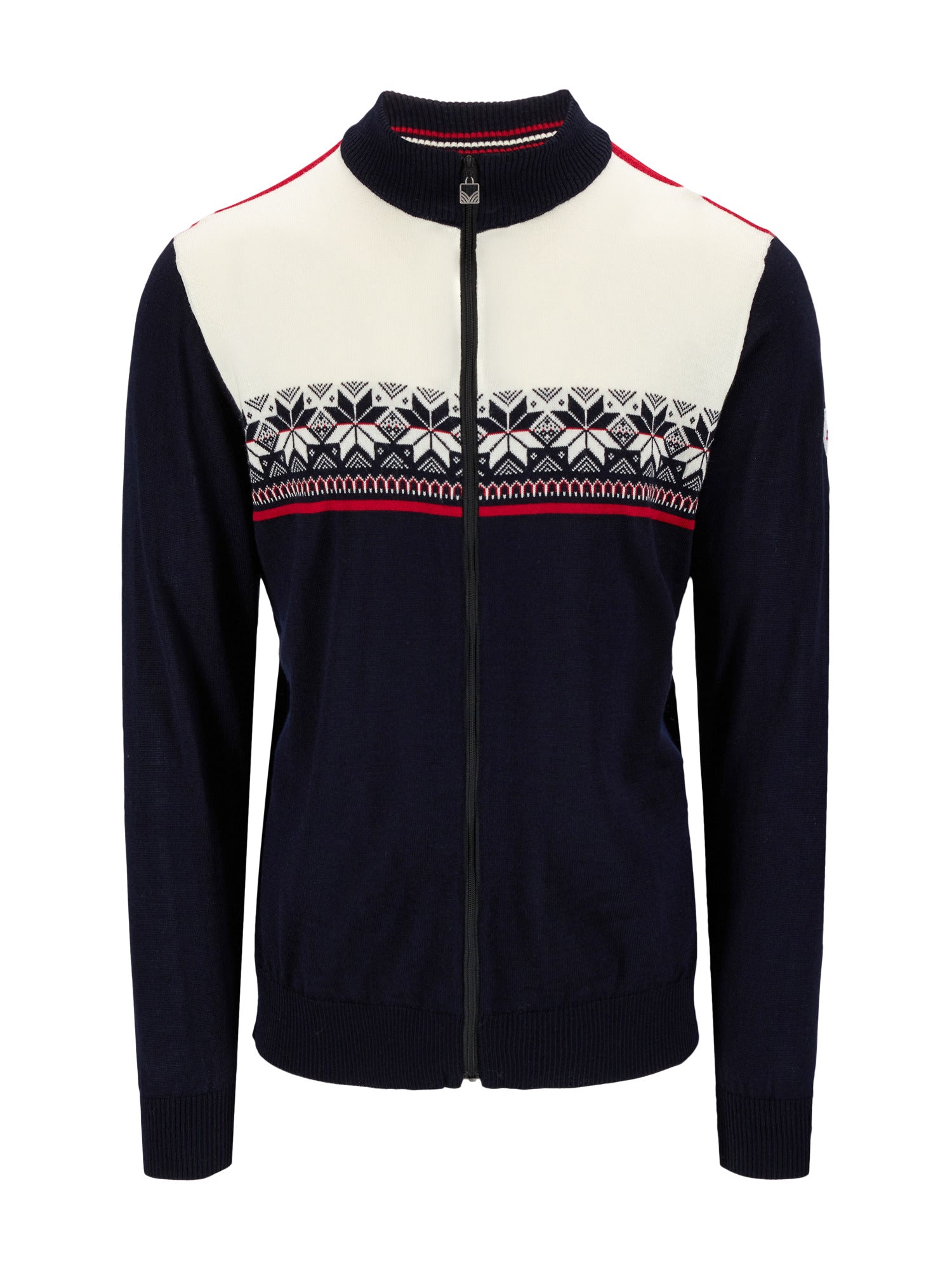 A sporty, lightweight, and soft merino wool jacket with block colors and a pattern featuring the classic eight-petal rose. The jacket has a zipper and a half-high collar. Liberg can be used both as a casual jacket and for sporting activities.