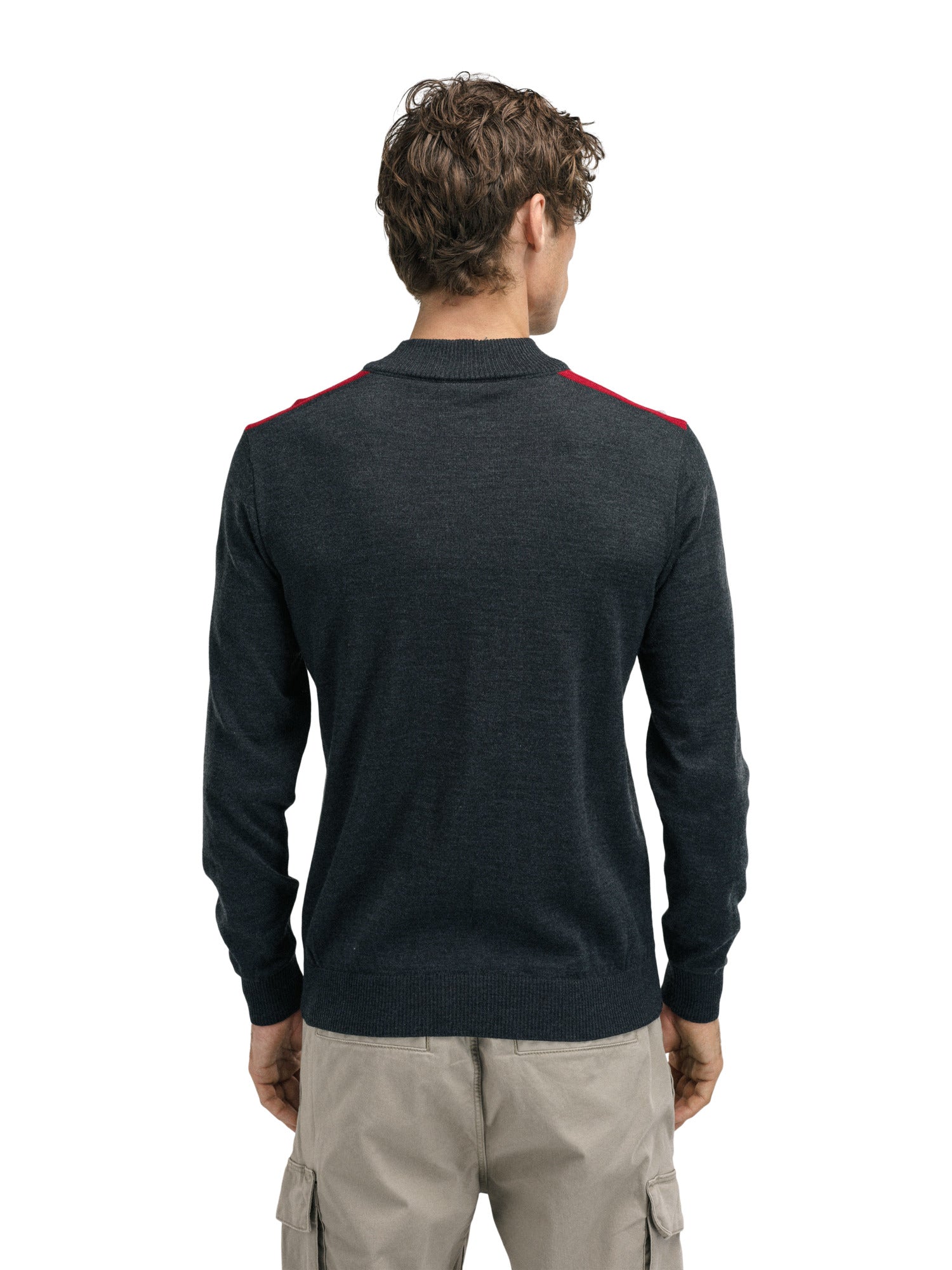 Eine sportliche, leichte und weiche Merinowolljacke für Herren mit Blockfarben und Muster mit der klassischen achtblättrigen Rose.