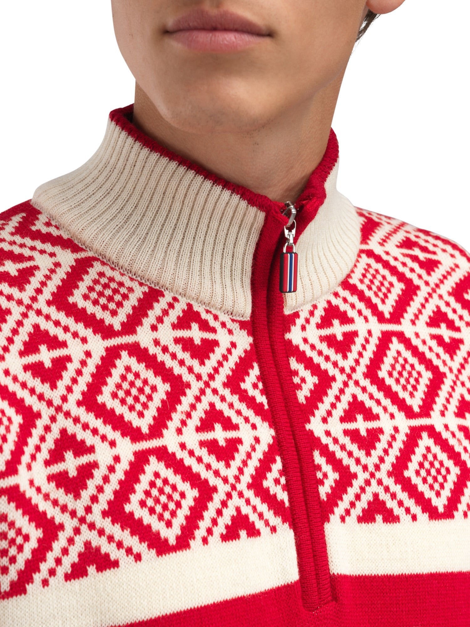 This is the official sweater for the Norwegian team for the 2026 Winter Olympics in Milan-Cortina—a true celebration of Norwegian heritage and Olympic history. Inspired by our first official Olympic sweater, the iconic design from the 1956 Winter Olympics in Cortina d'Ampezzo, this redesigned version celebrates its 70th anniversary. In honor of seven decades of tradition, we have transformed the beloved classic into a sporty and stylish half-zip sweater that combines timeless design with modern flair. With its high neckline and regular fit that allows for easy layering, this sweater captures the essence of Norwegian craftsmanship and passion for winter sports. It is available in two colorways, both inspired by the Norwegian flag: red and white, and blue and white.