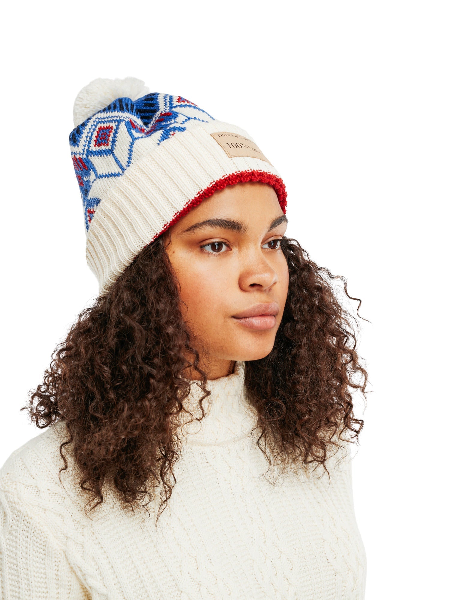 Die Vilja Hat von DALE OF NORWAY ist eine Wollmütze mit vergrößertem und vereinfachtem Muster, das die klassische norwegische achtblättrige Rose zeigt.