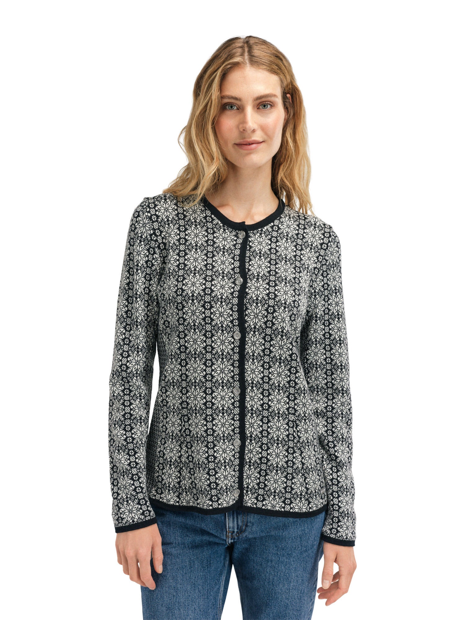 Die Othelie Jacket von DALE OF NORWAY ist eine dünne, leichte Wolljacke für Damen mit Knopfverschluss.